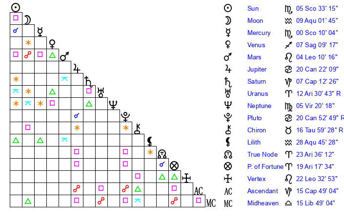| Moon | 9 Aquarius 12 | 6 Aquarius 51 | 23 Cancer 31 |