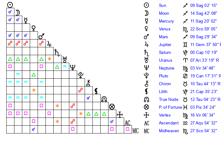 | Moon | 14 Sagittarius 38 | 23 Aries 53 | 10 Gemini 39 |