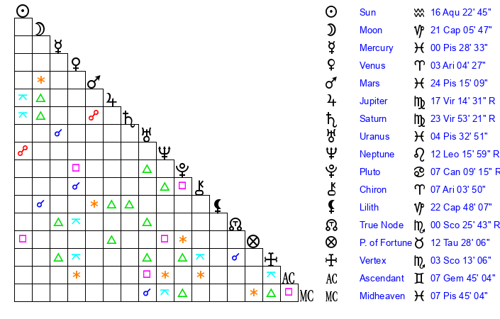 | Sun | 16 Aquarius 22 | 17 Aquarius 9 | 29 Taurus 6 |