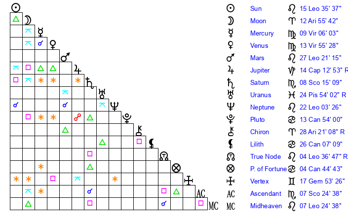 | Neptune | 22 Leo 3 | 1 Aries 51 | 24 Leo 45 |