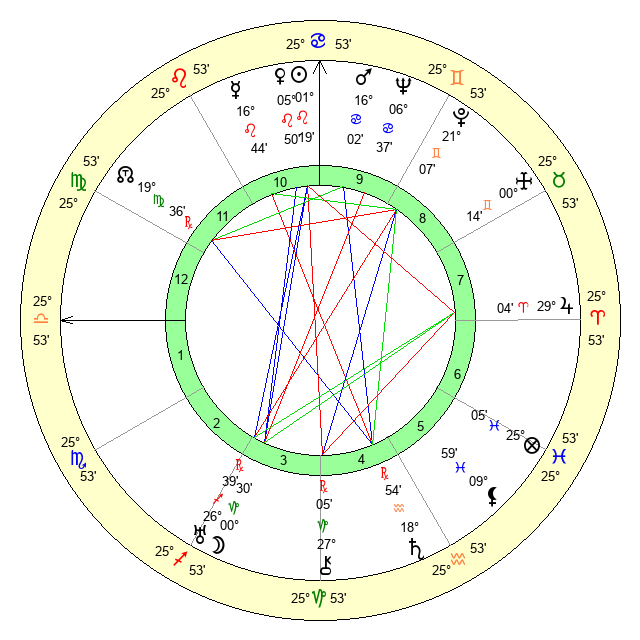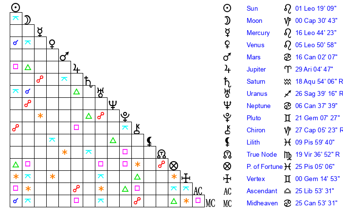 | Moon | 0 Capricorn 25 | 0 Leo 46 | 25 Taurus 0 |