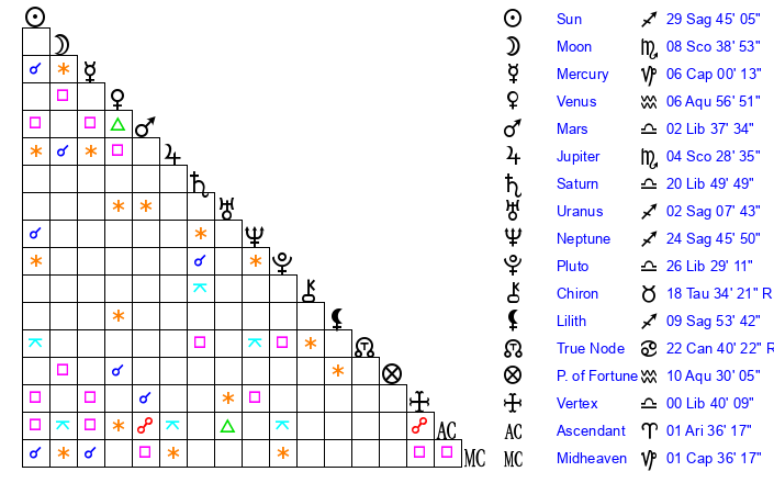 | Sun | 29 Sagittarius 45 | 0 Capricorn 20 | 13 Aquarius 32 |