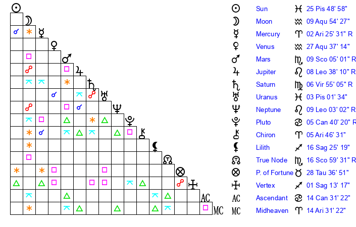 | Moon | 9 Aquarius 45 | 22 Libra 44 | 19 Sagittarius 34 |