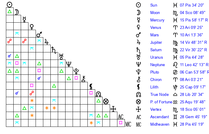 | Sun | 7 Pisces 34 | 8 Pisces 21 | 19 Gemini 14 |