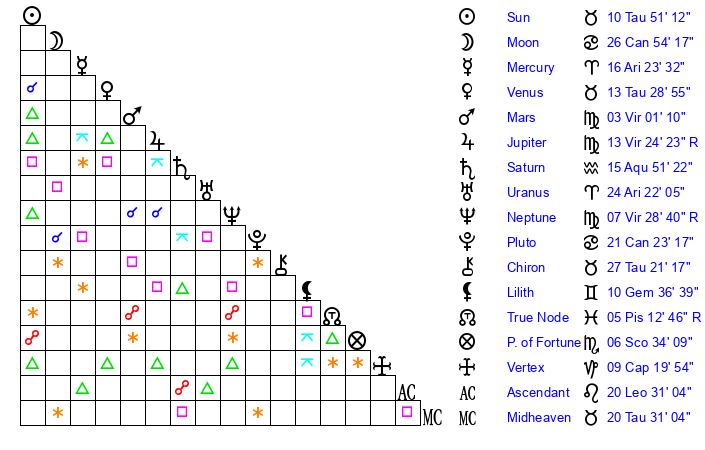 | Sun | 10 Taurus 51 | 11 Taurus 34 | 8 Leo 57 |