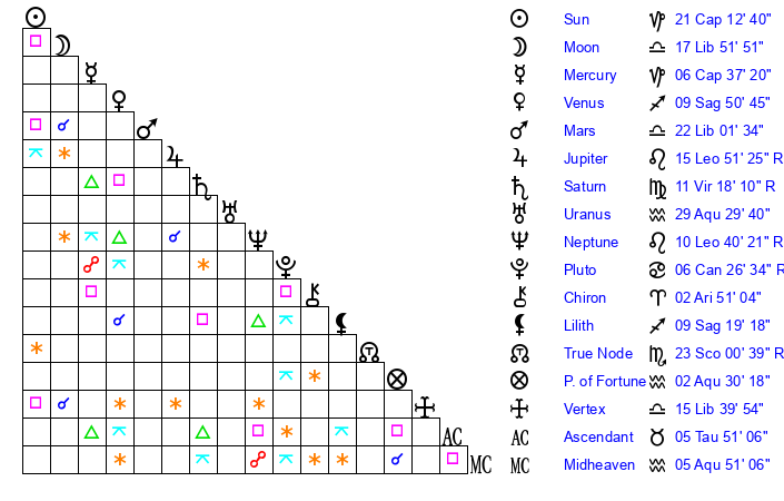 | Saturn | 12 Virgo 3 | 15 Pisces 26 | 5 Virgo 39 |