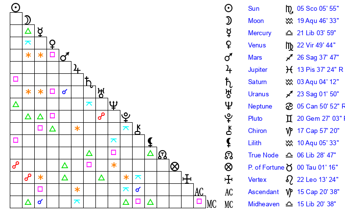 | Mercury | 21 Libra 4 | 0 Sagittarius 15 | 18 Aquarius 2 |