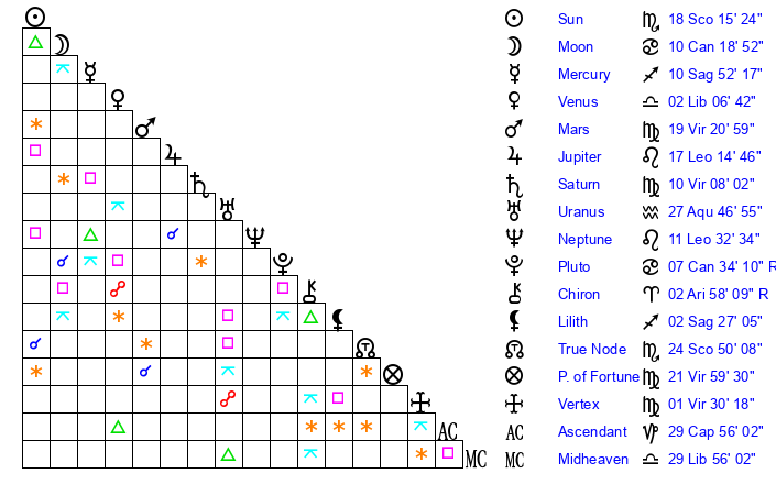 | Sun | 18 Scorpio 15 | 19 Scorpio 33 | 5 Pisces 48 |
