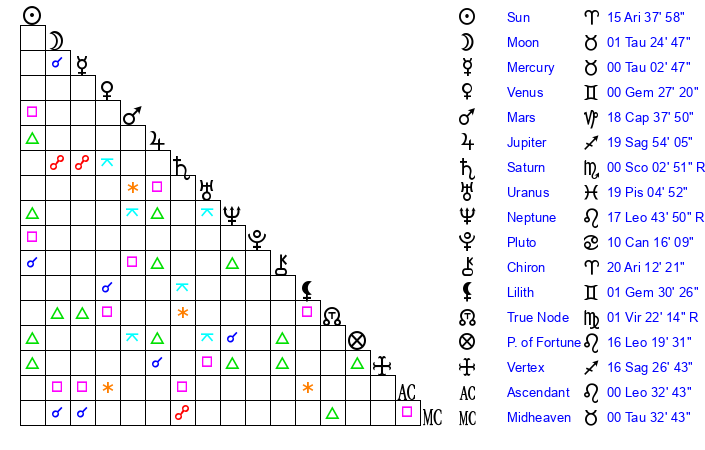 | Neptune | 17 Leo 43 | 0 Aries 14 | 19 Leo 5 |