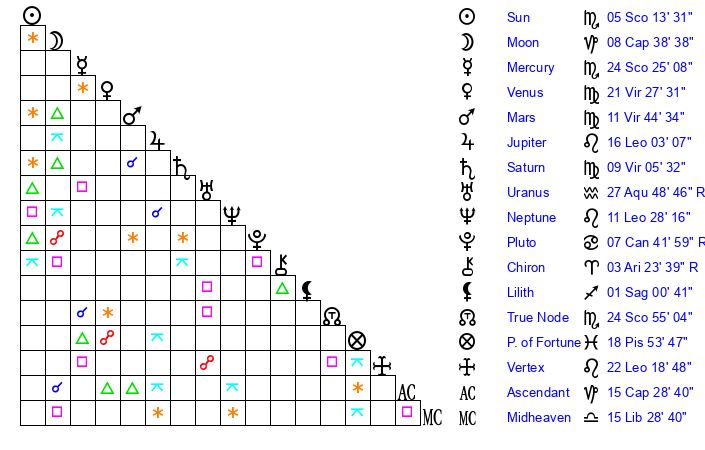 | Sun | 5 Scorpio 13 | 6 Scorpio 31 | 22 Aquarius 42 |