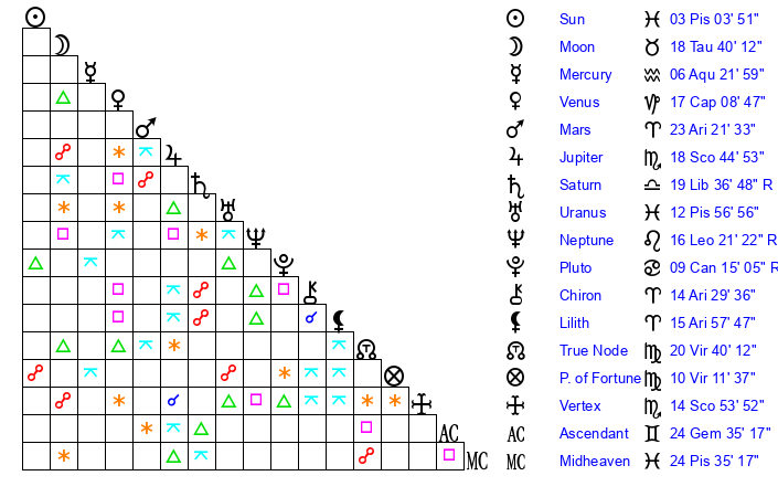 | Sun | 3 Pisces 3 | 4 Pisces 19 | 13 Gemini 2 |