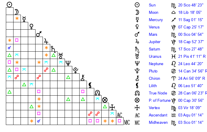 | Sun | 20 Scorpio 49 | 21 Scorpio 34 | 2 Pisces 20 |