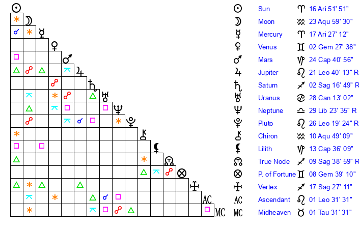 | Sun | 16 Aries 51 | 17 Aries 8 | 23 Gemini 34 |