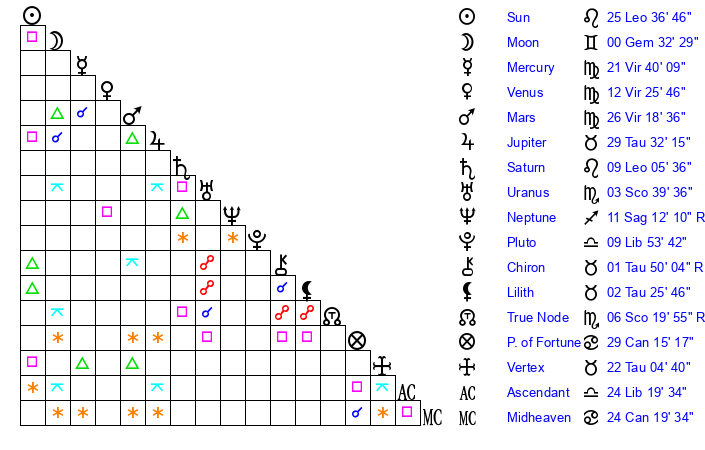| Moon | 0 Gemini 27 | 25 Gemini 10 | 23 Pisces 57 |