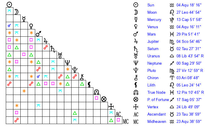 | Sun | 4 Aquarius 18 | 4 Aquarius 58 | 29 Pisces 40 |
