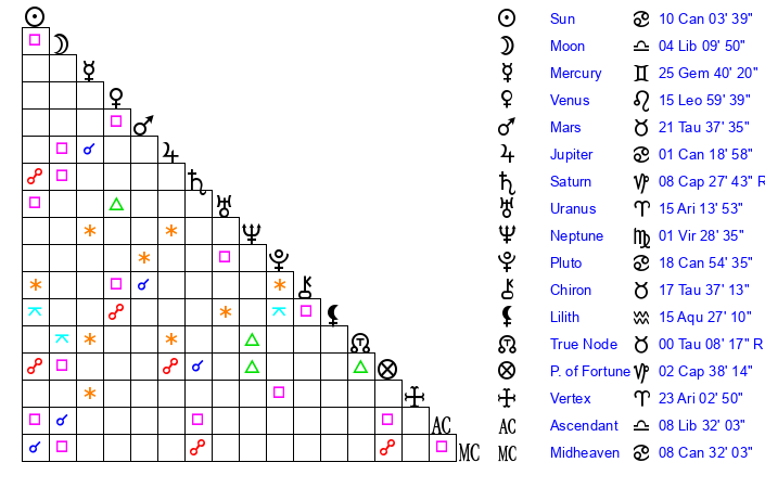| Moon | 4 Libra 14 | 9 Libra 59 | 18 Pisces 35 |