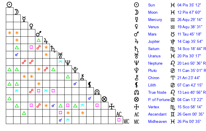 | Sun | 4 Pisces 35 | 5 Pisces 20 | 12 Gemini 34 |