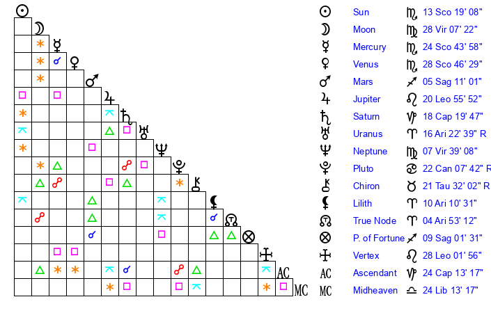 | Sun | 13 Scorpio 19 | 14 Scorpio 32 | 18 Aquarius 44 |