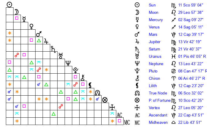 | Sun | 11 Scorpio 59 | 12 Scorpio 32 | 28 Aquarius 31 |