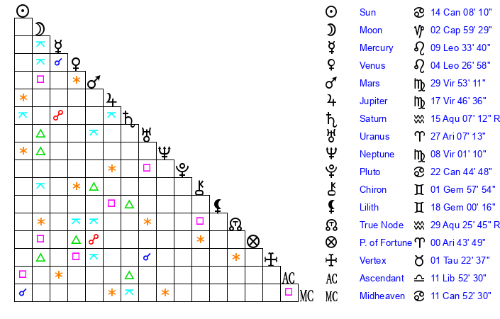 | Neptune | 8 Virgo 1 | 2 Aries 10 | 11 Virgo 7 |