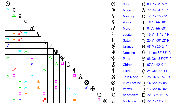 | Sun | 0 Pisces 32 | 1 Pisces 18 | 12 Gemini 32 |