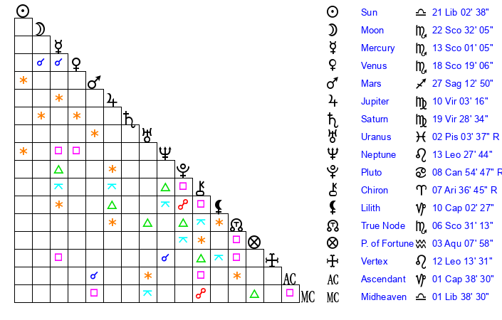 | Sun | 21 Libra 2 | 21 Libra 36 | 7 Aquarius 15 |