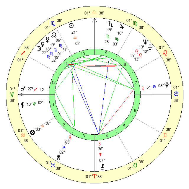 | Moon | 22 Scorpio 32 | 3 Leo 23 | 28 Virgo 50 |