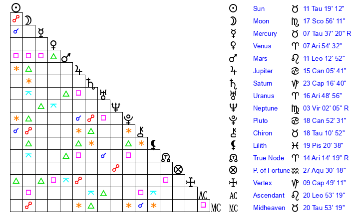 | Sun | 11 Taurus 19 | 12 Taurus 32 | 11 Leo 20 |