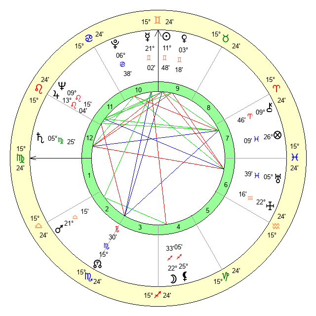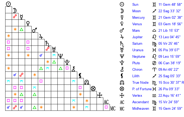 | Sun | 11 Gemini 49 | 12 Gemini 24 | 22 Virgo 31 |