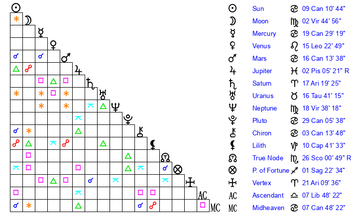 | Mercury | 19 Cancer 30 | 5 Leo 53 | 21 Virgo 55 |
