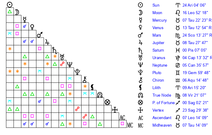 | Sun | 24 Aries 4 | 25 Aries 0 | 19 Leo 17 |