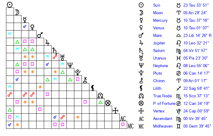 | Sun | 23 Taurus 34 | 24 Taurus 9 | 4 Virgo 5 |