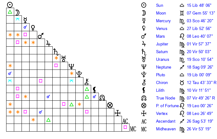 | Sun | 15 Libra 48 | 16 Libra 39 | 1 Sagittarius 49 |