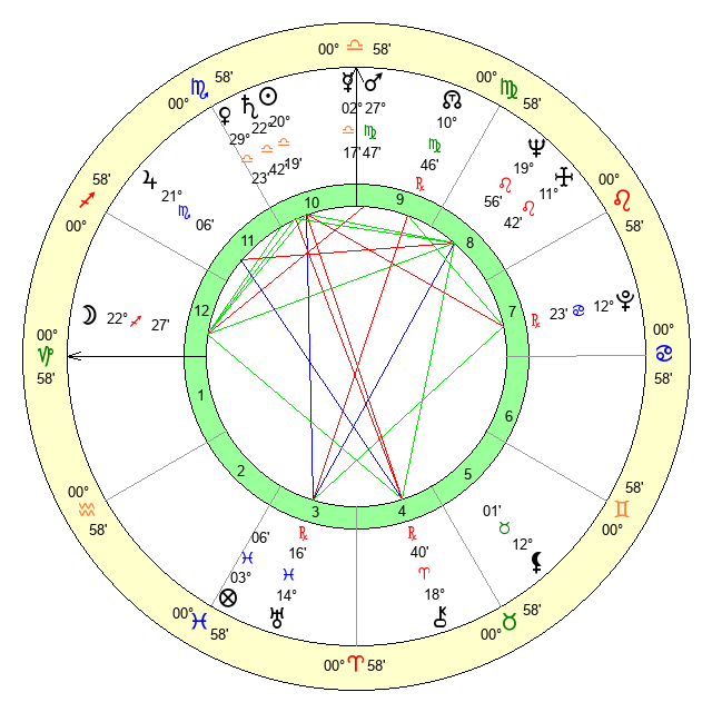 | Moon | 22 Sagittarius 22 | 3 Leo 23 | 5 Virgo 38 |
