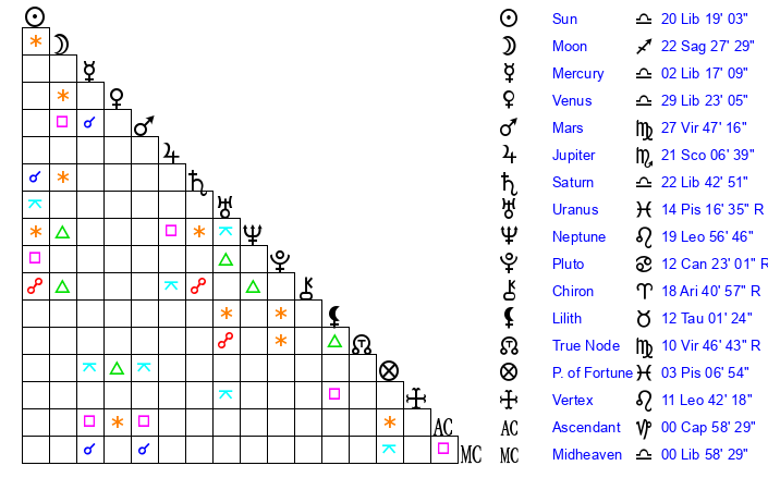 | Saturn | 23 Libra 17 | 26 Pisces 40 | 2 Scorpio 40 |