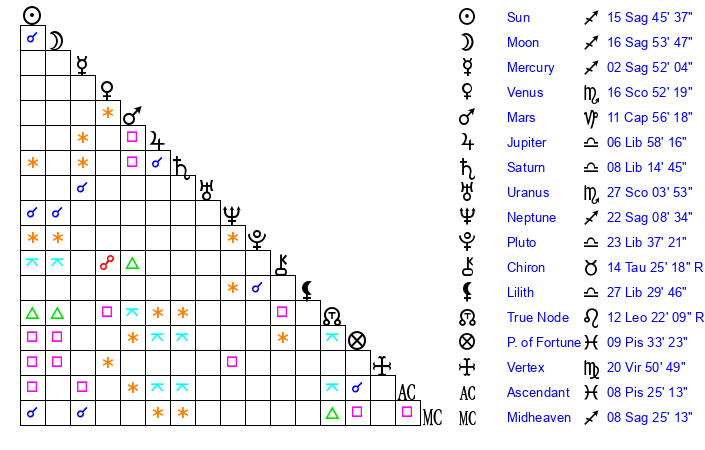 | Neptune | 22 Sagittarius 9 | 27 Pisces 7 | 23 Sagittarius 44 |