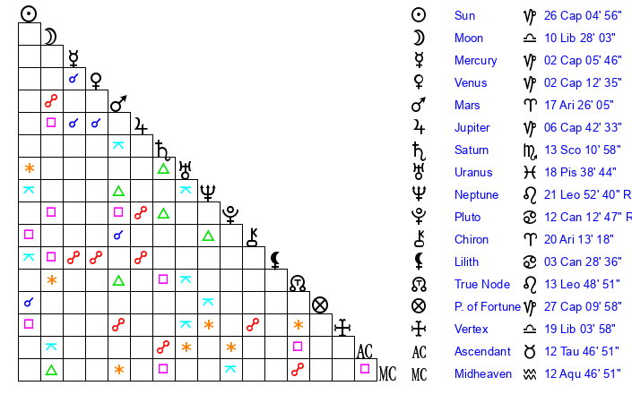 | Venus | 2 Capricorn 13 | 13 Pisces 50 | 6 Taurus 38 |