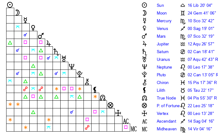 | Moon | 24 Gemini 39 | 3 Gemini 58 | 18 Cancer 15 |