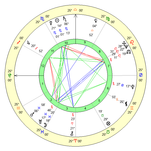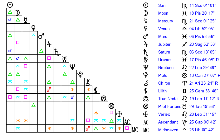 | Saturn | 6 Scorpio 44 | 25 Pisces 27 | 14 Scorpio 49 |