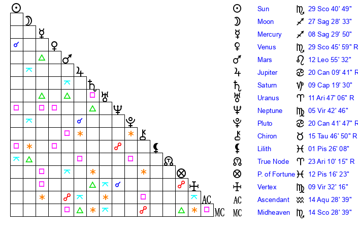 | Moon | 27 Sagittarius 30 | 27 Sagittarius 9 | 6 Gemini 14 |