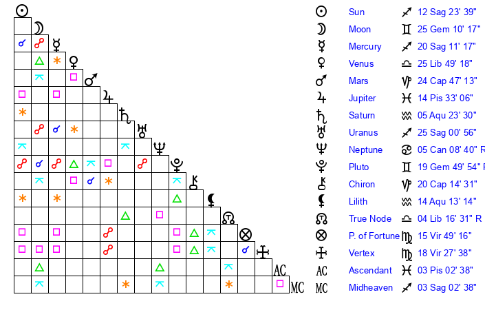 | Moon | 25 Gemini 0 | 24 Gemini 18 | 22 Sagittarius 7 |