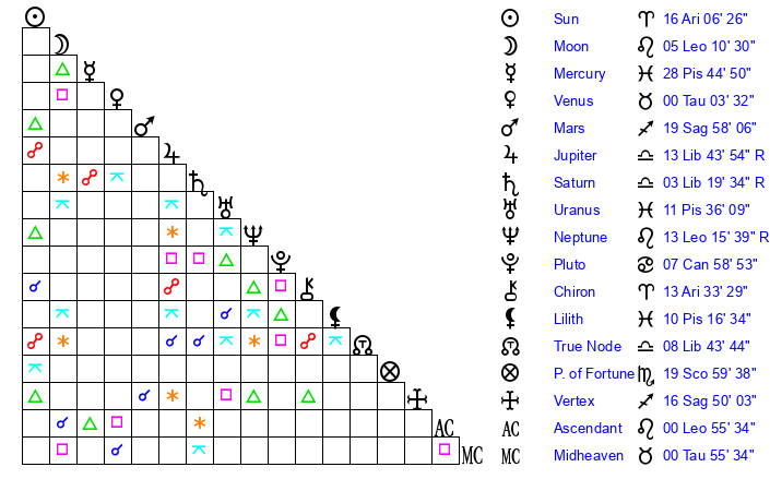 | Neptune | 13 Leo 15 | 0 Aries 16 | 14 Leo 55 |