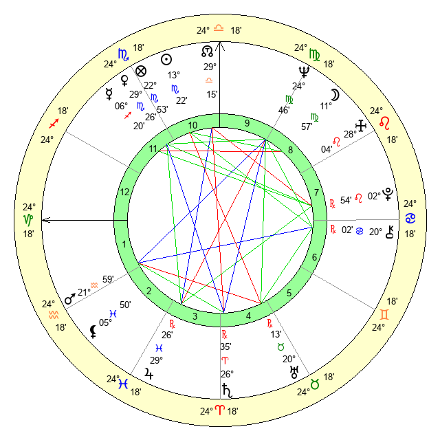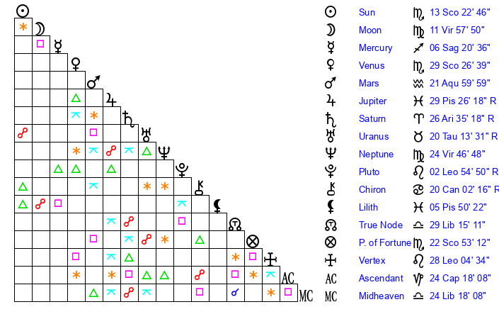 | Neptune | 24 Virgo 47 | 29 Pisces 40 | 25 Virgo 12 |