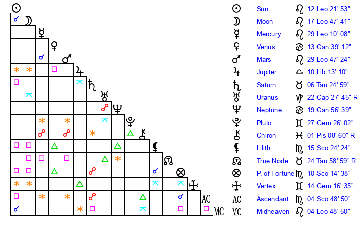 | Moon | 17 Leo 45 | 29 Sagittarius 56 | 1 Scorpio 21 |