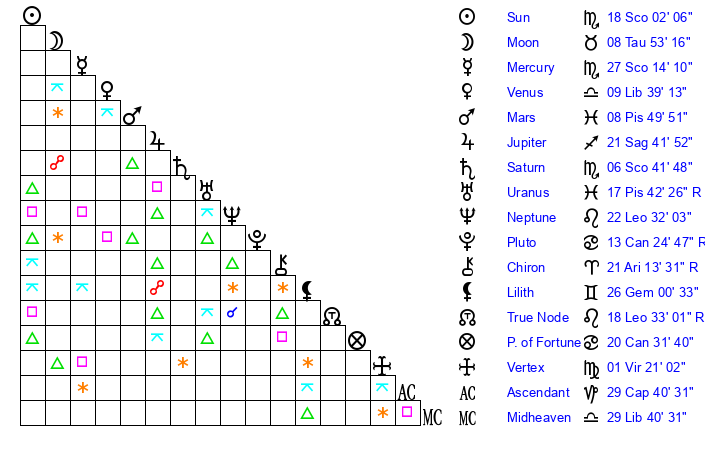 | Sun | 18 Scorpio 2 | 18 Scorpio 33 | 0 Pisces 33 |