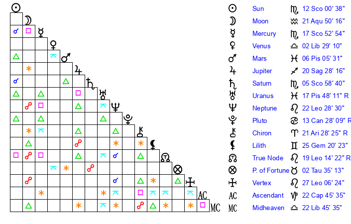 | Saturn | 6 Scorpio 30 | 25 Pisces 32 | 14 Scorpio 48 |