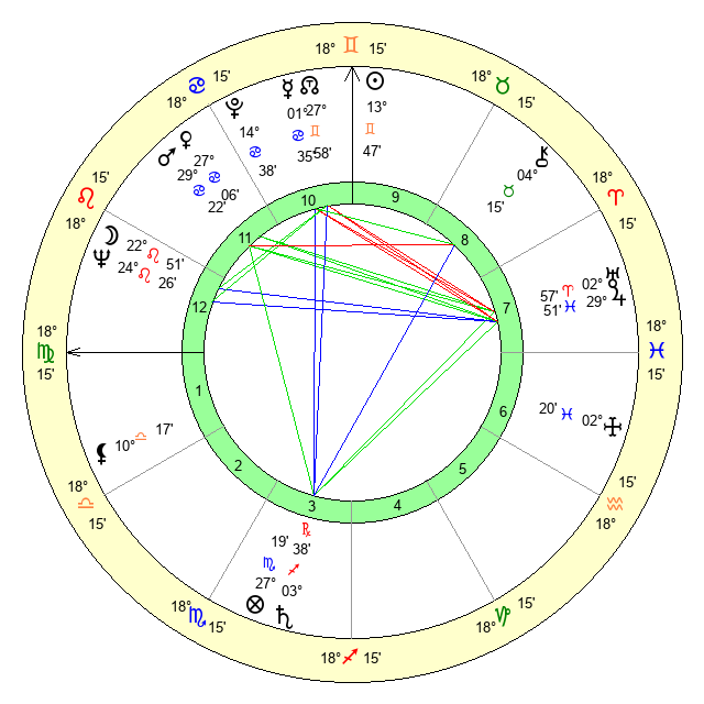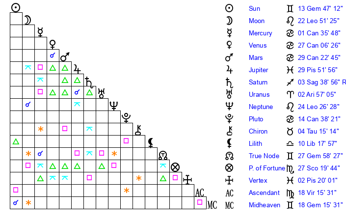 | Sun | 13 Gemini 47 | 15 Gemini 2 | 17 Virgo 42 |