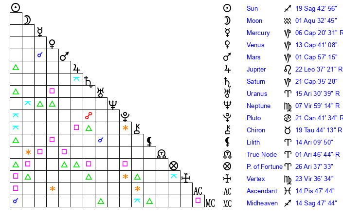 | Sun | 19 Sagittarius 43 | 21 Sagittarius 10 | 23 Pisces 55 |