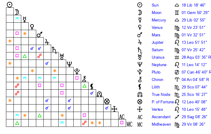 | Saturn | 8 Virgo 5 | 26 Pisces 48 | 11 Virgo 24 |