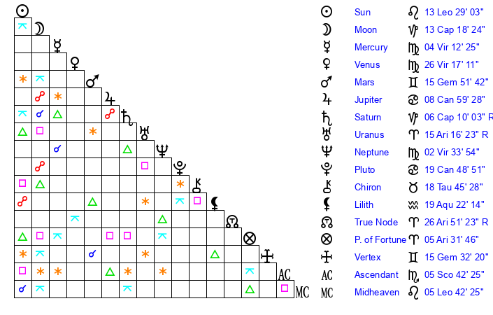 | Moon | 13 Capricorn 16 | 12 Capricorn 34 | 26 Gemini 59 |